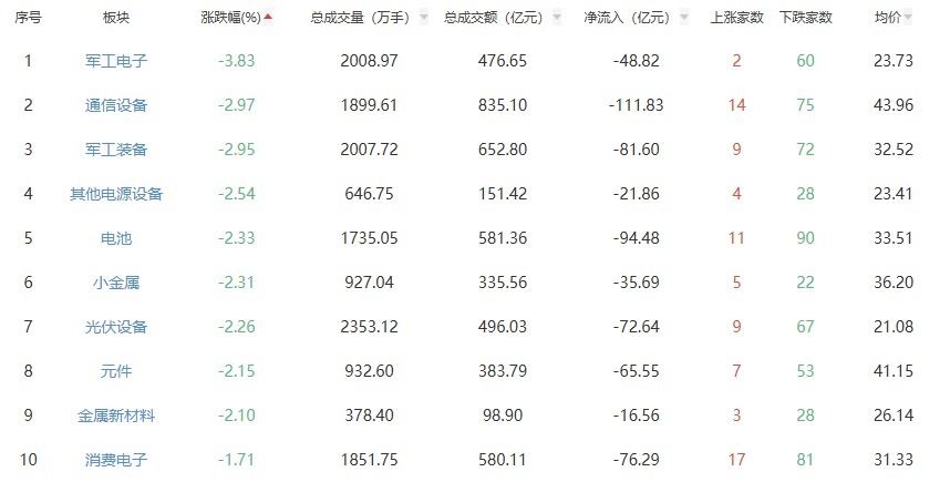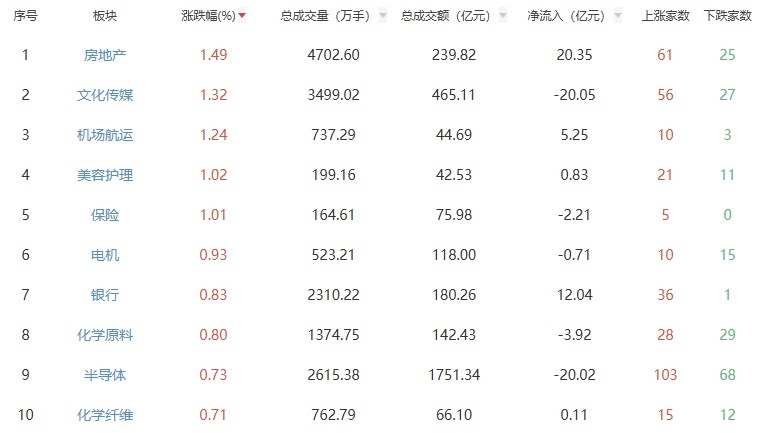 板块方面,房地产、文化传媒、机场航运等板块涨幅居前,军工电子、通信设备、军工装备等板块跌幅居前。
